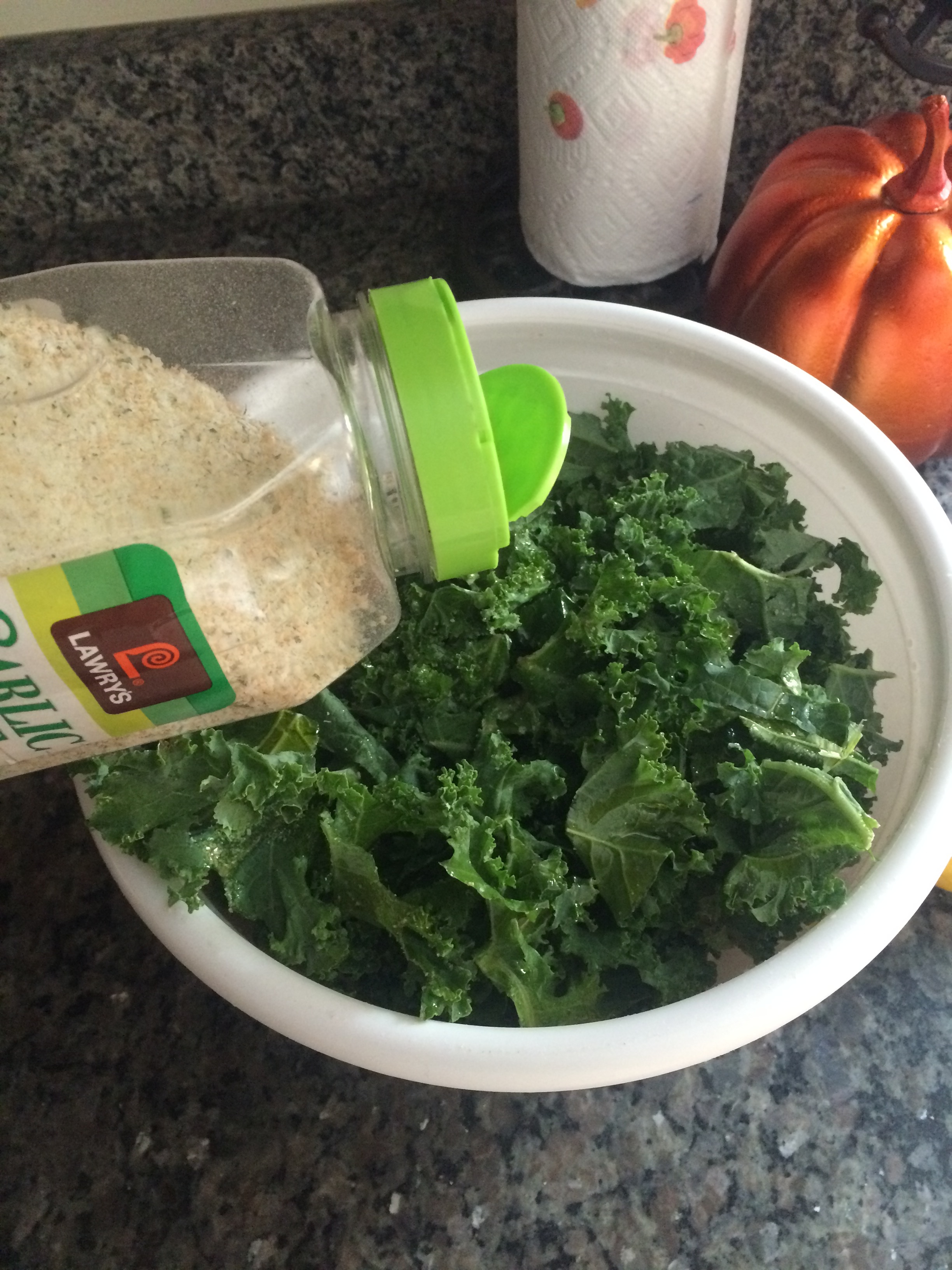 I grabbed a bag of kale from Costco, drizzled a little olive oil on it, then squeeze half a lemon on it, making sure it is over all the salad.